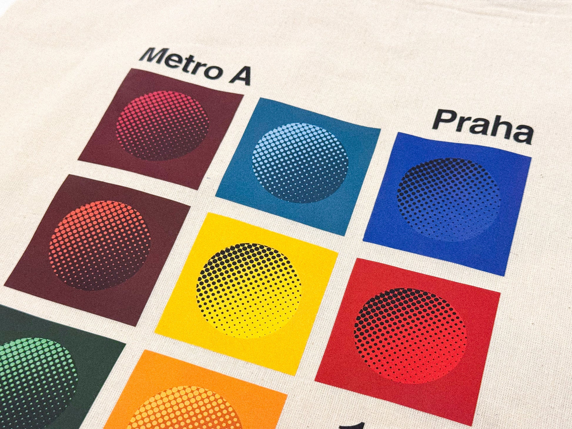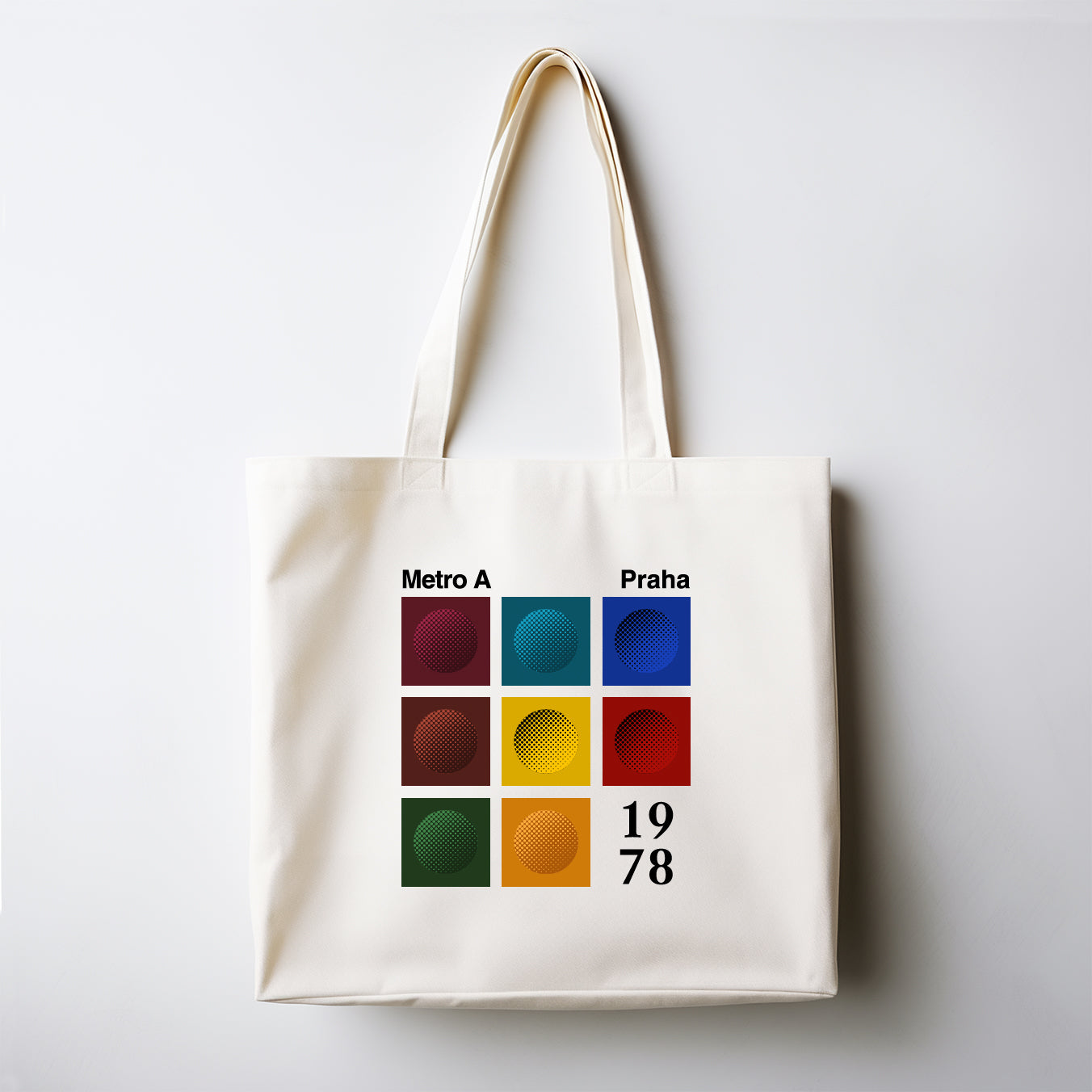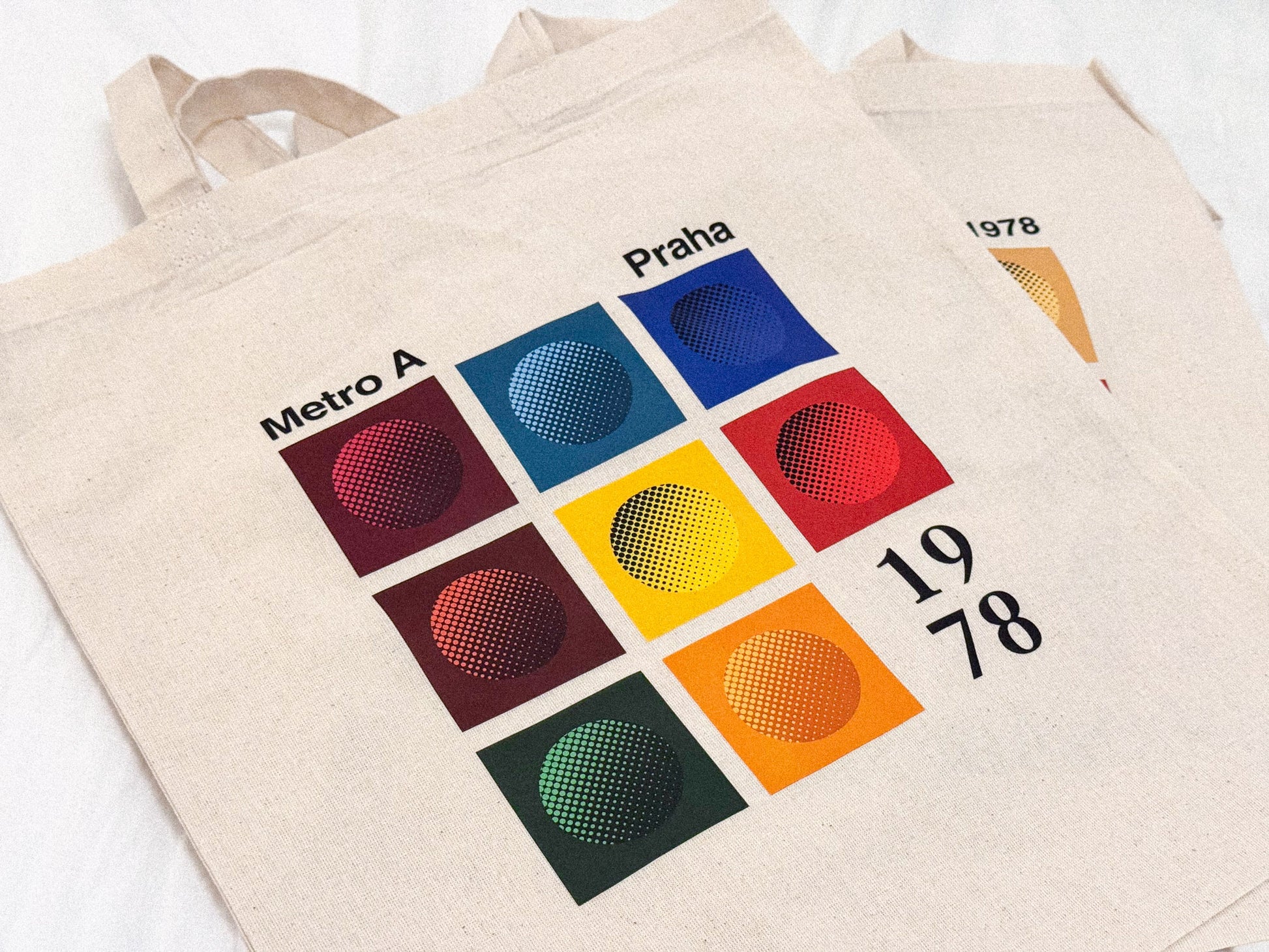 Plátěná taška s designem odkazujícím na architekturu stanic pražského metra A